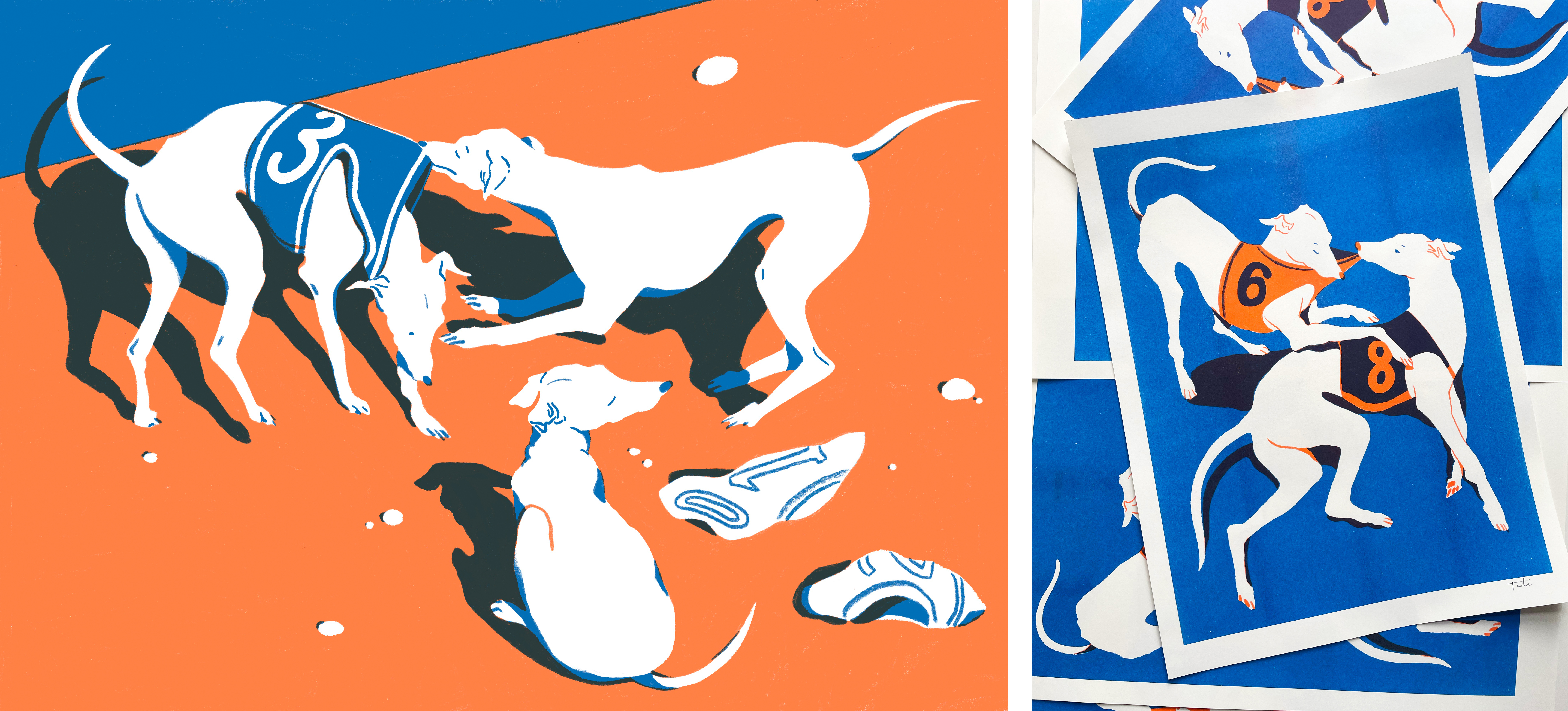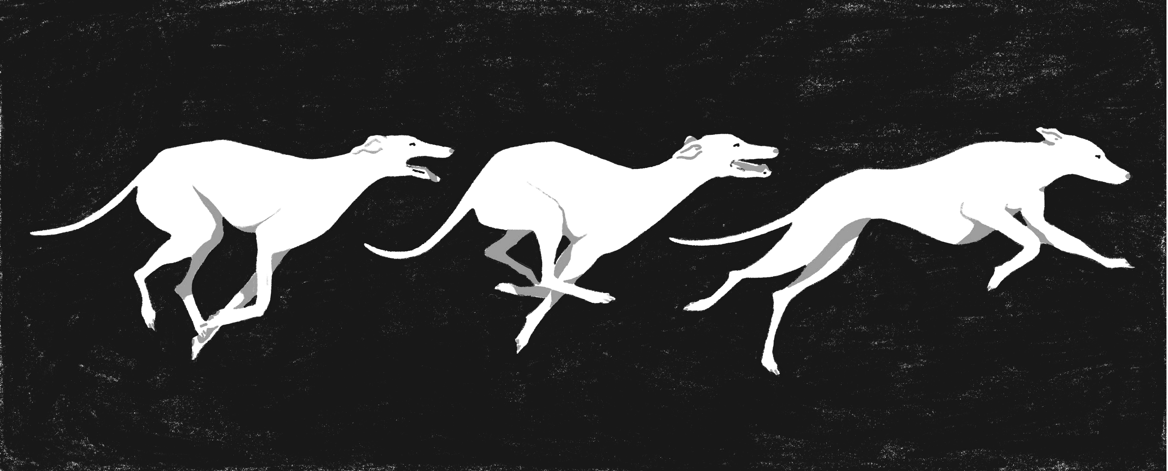 A collection of illustrations and prints that delves into the often dark world of Greyhound racing. The greyhound dogs rip off their racing stripes and celebrate their freedom.